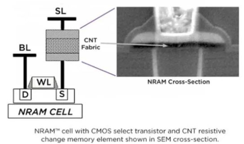 Nantero公司已經(jīng)花費了將近20年的時間來研究NRAM,該技術(shù)基于排列在交叉點電極之間的薄層中的無規(guī)組織的碳納米管的漿料。當施加電壓時,CNT被拉到一起,接觸點數(shù)量的增加減少了電極之間的電阻路徑。這種連接是由范德華力在原子級上保持的。為了復(fù)位存儲單元,電壓脈沖會引起熱振動來斷開這些連接。