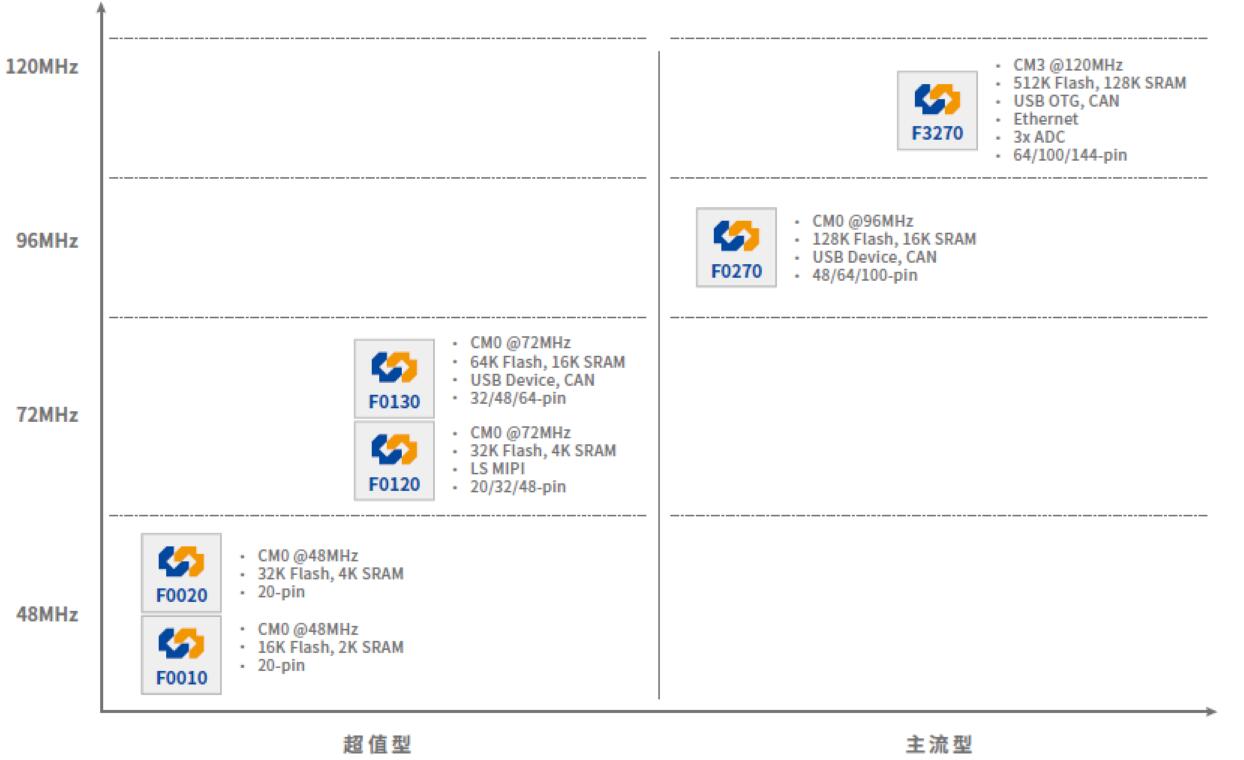 在超值型產品中,增加了可用的GPIO數量,并提高了72MHz M0產品的存儲容量比,以便支持更強的計算處理能力。