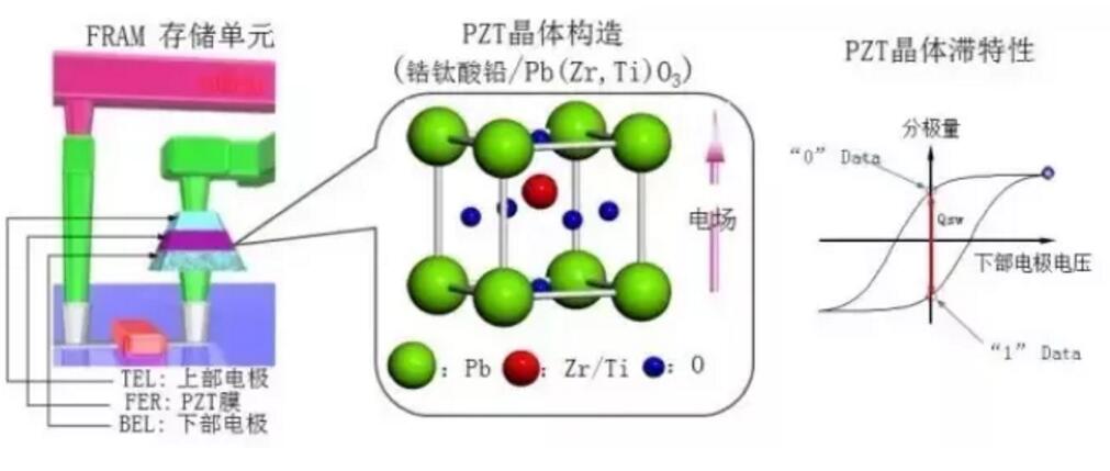 FRAM是運用鐵電材料(PZT等)的鐵電性和鐵電效應來進行非易失性數據存儲又可以像RAM一樣操作。