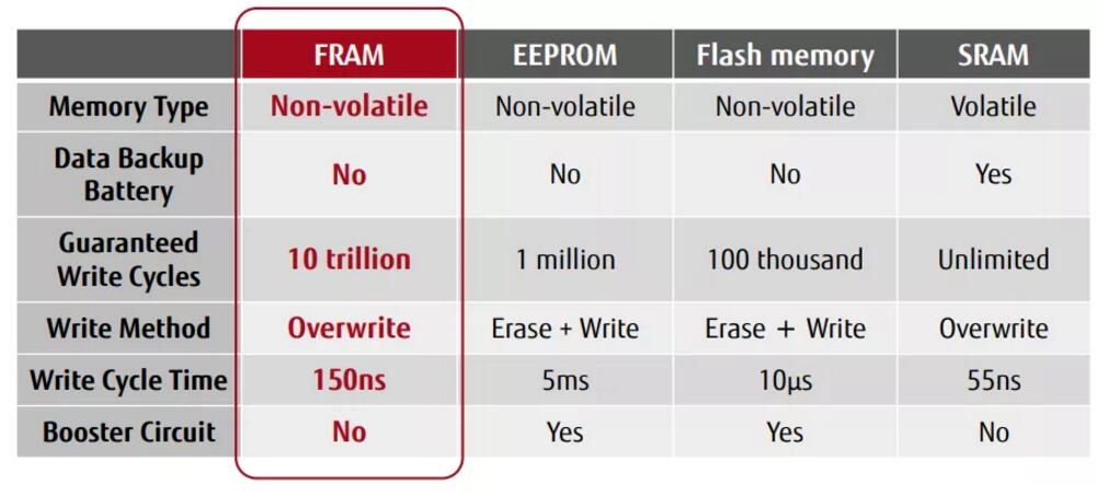 其中FRAM寫入次數壽命高達10萬億次、而EEPROM僅有百萬次(10^6)。同時,FRAM寫入數據可在150ns內完成、速度約為EEPROM的1/30,000,寫入一個字節數據的功耗僅為150nJ、約為EEPROM的1/400,在電池供電應用中具有無與倫比的優勢。