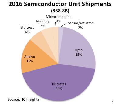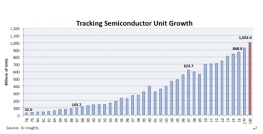 IC Insights透露,全球半導體(包括光電器件、集成電路、分立器件與傳感器)出貨量將持續穩定上升,并希望在2018年第一次達到年出貨量超過1萬億顆的目標。