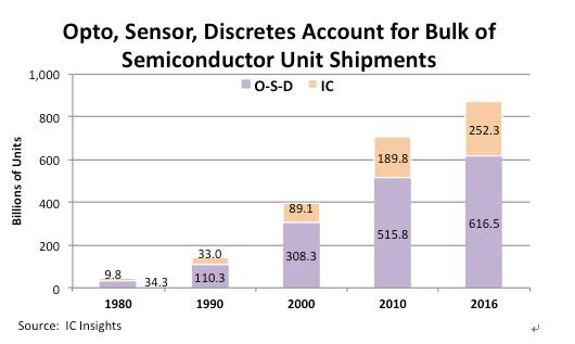 雖然集成電路技術不斷發展,越來越多的功能被集成到一顆存儲芯片中,從而以系統的角度來看用到的芯片數量越來越少,但IC Insights的統計結果顯示,全球半導體出貨量中,集成電路占比依然很低,而光電器件、傳感器與分立器件(Opto-Sensor-Discrete,簡稱O-S-D)的比重仍然超過七成。