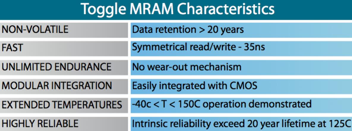 切換MRAM使用1個晶體管,1個MTJ單元來提供簡單的高密度存儲器。Everspin使用獲得專利的Toggle電池設(shè)計(jì),可提供高可靠性。數(shù)據(jù)在溫度下20年始終是非易失性的。