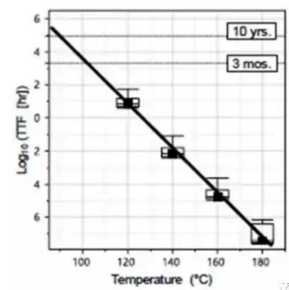 圖3.一組1Gb裸片的數(shù)據(jù)保留(DR)烘烤的失效時間與溫度的關(guān)系。實(shí)線擬合表示在85°C情況下為10年的DR,在100°C情況下為3個月的DR。