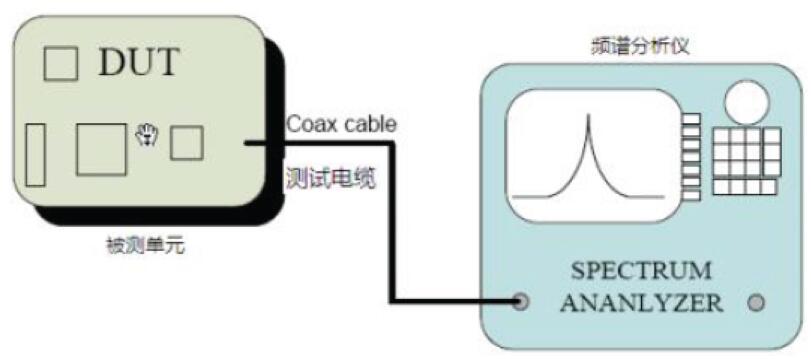 射頻發射信號通過產品的天線耦合到頻譜分析儀。測試裝置連接如下: