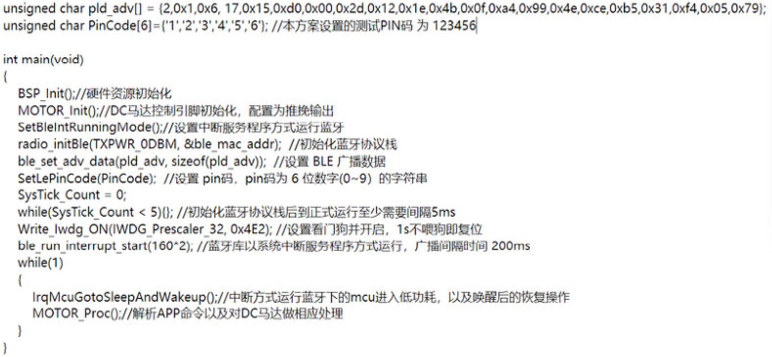 以下為主函數(shù)初始化配置內(nèi)容,主要將所有的外設(shè)資源和藍(lán)牙協(xié)議棧初始化,并且以中斷服務(wù)程序的方式運(yùn)行藍(lán)牙,主函數(shù)的循環(huán)中主要實(shí)現(xiàn)的功能為判斷是否進(jìn)入低功耗模式,并且喚醒后根據(jù)接收到的藍(lán)牙數(shù)據(jù)對(duì)DC馬達(dá)進(jìn)行不同的操作,代碼如下: