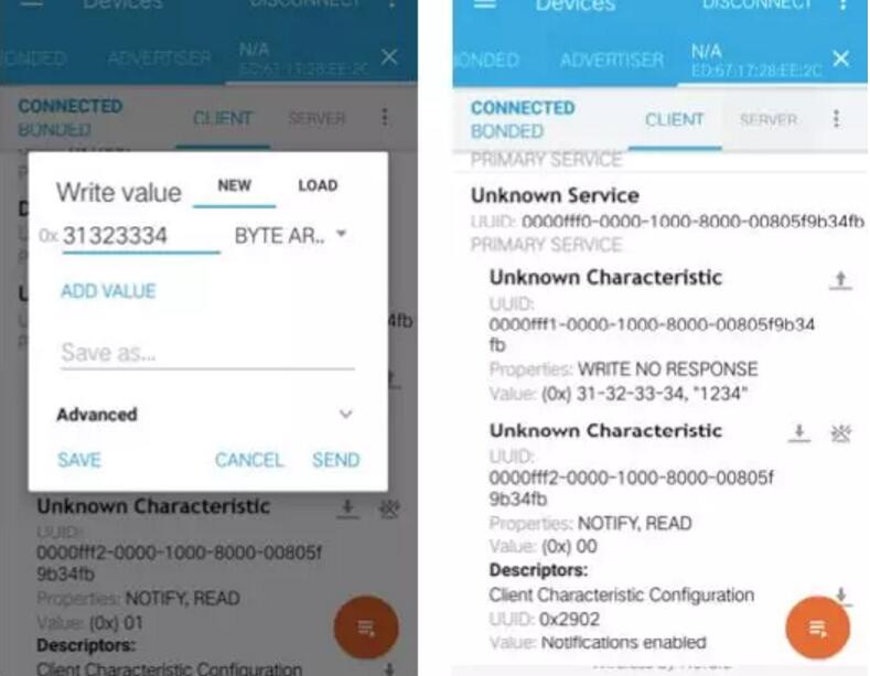 連接成功后,對(duì)UUID為fff1的特征值寫0x31323334(模擬用戶輸入密碼”1234”),測(cè)試板上連接的馬達(dá)開(kāi)始轉(zhuǎn)動(dòng),執(zhí)行開(kāi)鎖動(dòng)作;