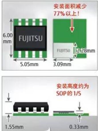 FRAM——MB85RS1MT,這是一款有8引腳晶圓級芯片尺寸封裝(WL-CSP)的產(chǎn)品,與傳統(tǒng)業(yè)界標(biāo)準(zhǔn)SOP封裝相比,此款WL-CSP大約為SOP的23%,能夠減少約77%的安裝面積。而且本W(wǎng)L-CSP的厚度為0.33mm,約是信用卡的一半,從安裝體積比來看,能夠減少大約95%的體積。 是