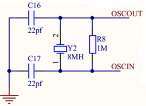 外部無源晶振電路如下圖所示,晶振兩腳接約 22pf 電容,并上 1M 反饋電阻。因芯片內部沒有集成反饋電阻,為保證 XTAL 起振,必須接 1M 歐姆電阻;